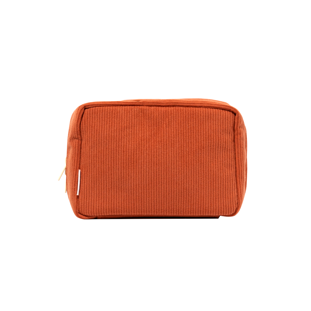 Orange corduroy case ideal for storing your cosmetics or beauty accessories.